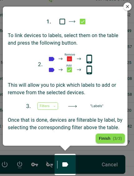 Once you select a tutorial, popups will highlight areas of interest and display information about the feature you're currently exploring. Press "Next" to advance to the next step, or "Finish" to conclude the tutorial.